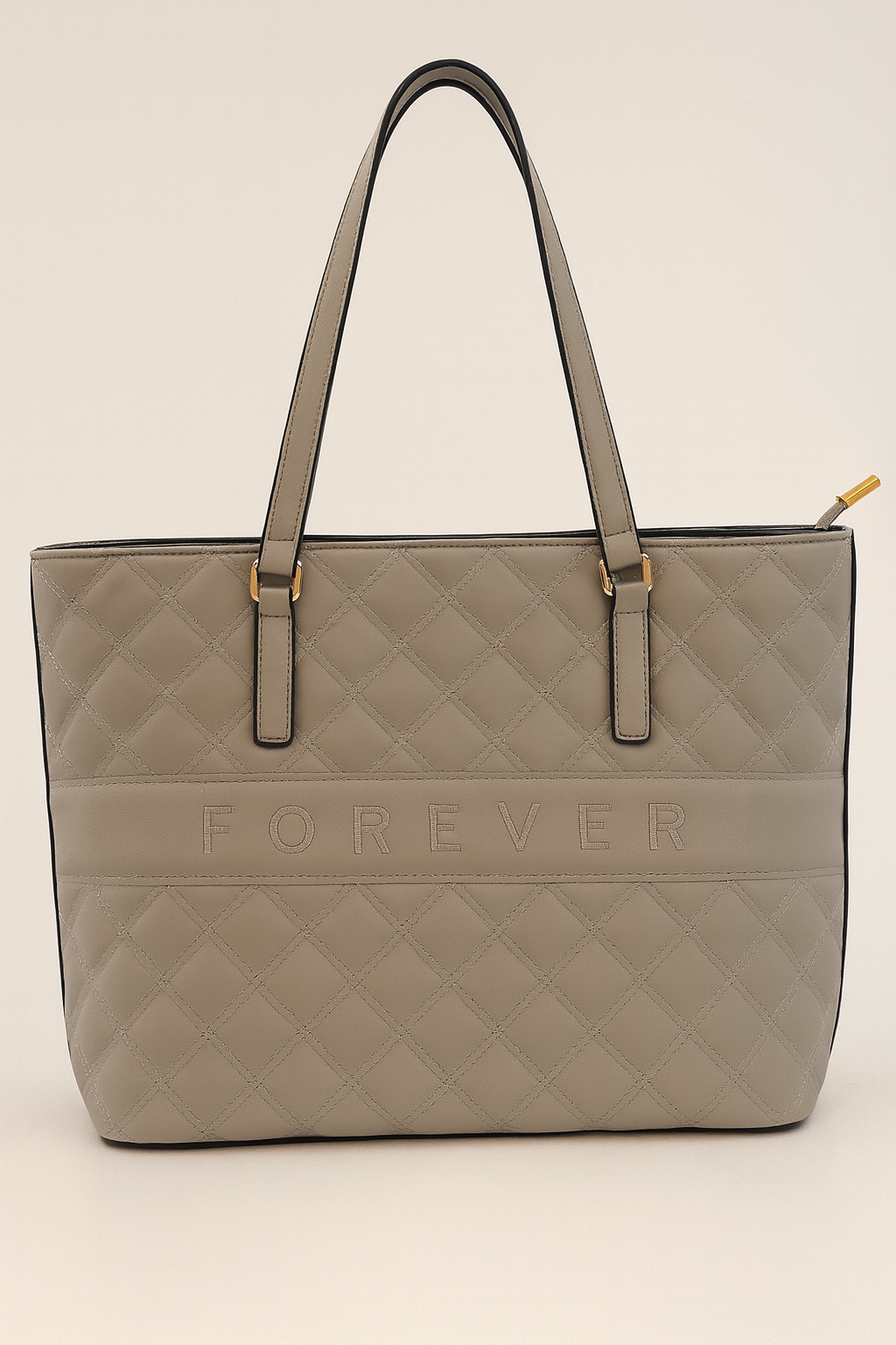 شنطة جلد أنيقة من ماركة FOREVER باللون الرمادي الفاتح، بتصميم راقٍ مزخرف بخياطة مربعات تضيف لمسة من الفخامة. تتميز بمساحة داخلية واسعة ومقابض مريحة تجعلها مثالية للاستخدام اليومي والمناسبات الرسمية.