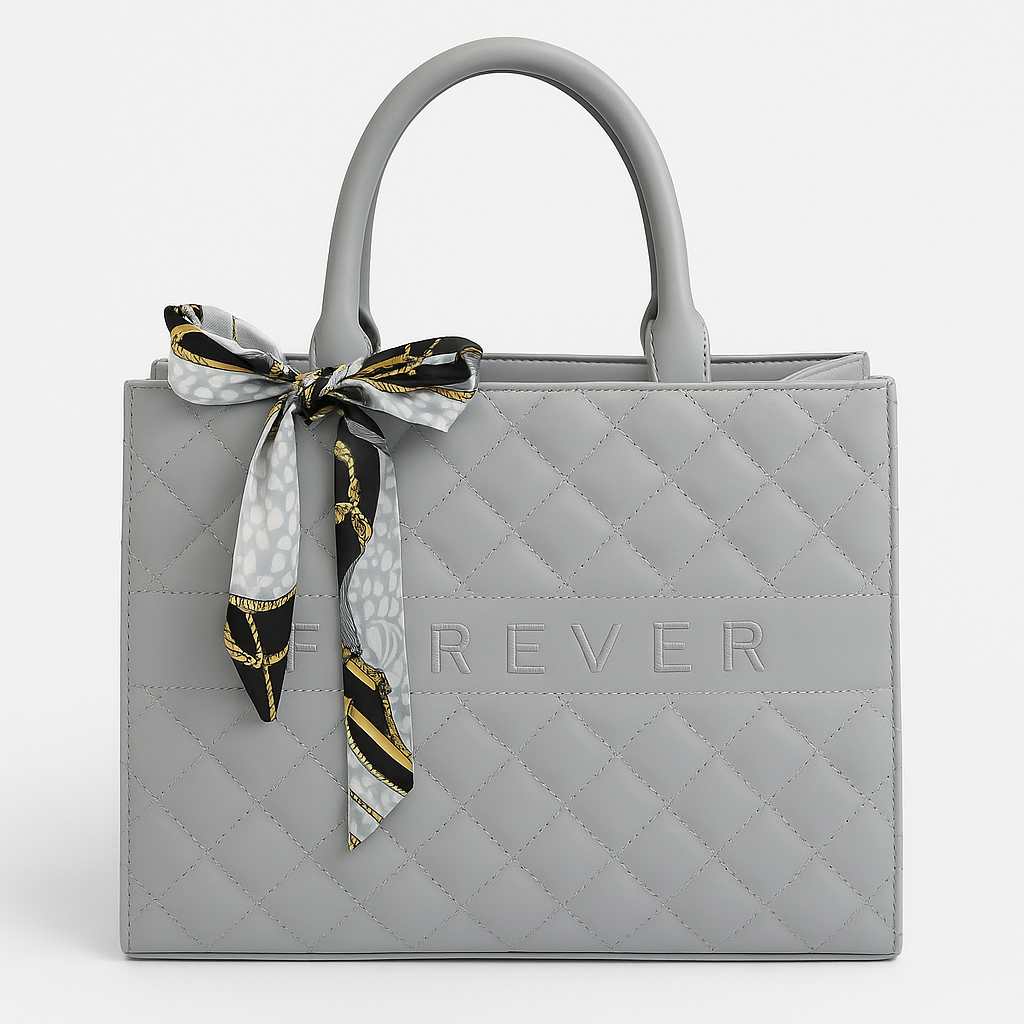 Elegant gray leather handbag featuring a decorative scarf, designed for a modern and sophisticated look.
