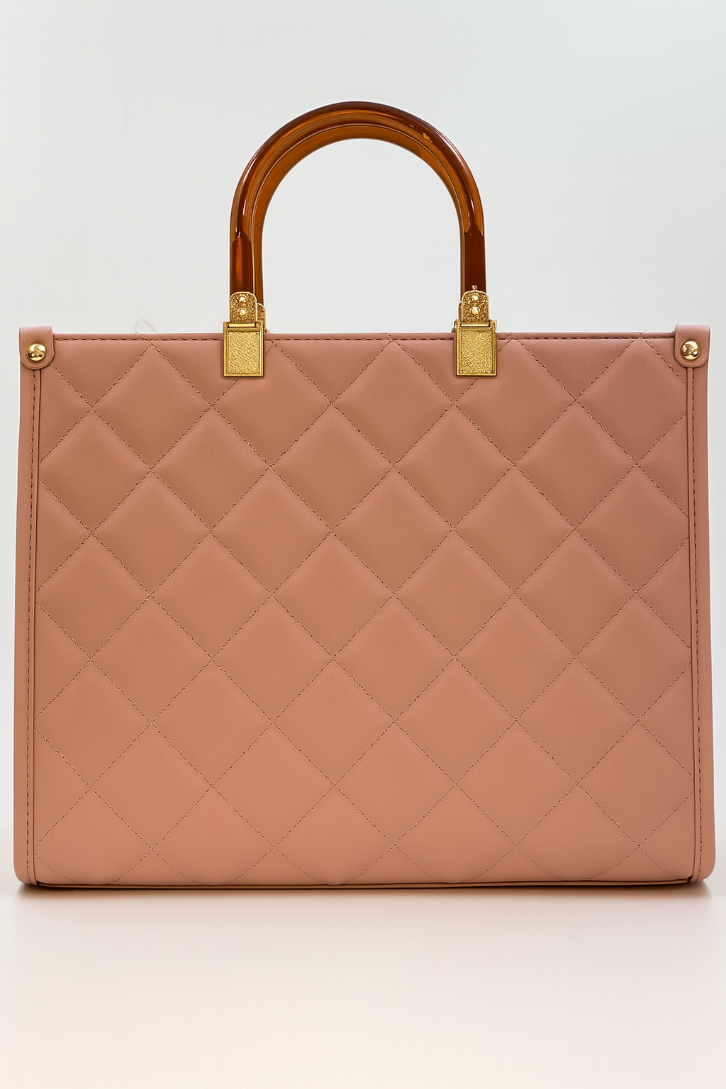 Elegant pink leather handbag by FOREVER, featuring a stylish brown transparent handle that adds a modern and sophisticated touch. Designed with fine quilted stitching for a classy and feminine look, perfect for daily wear and special occasions.