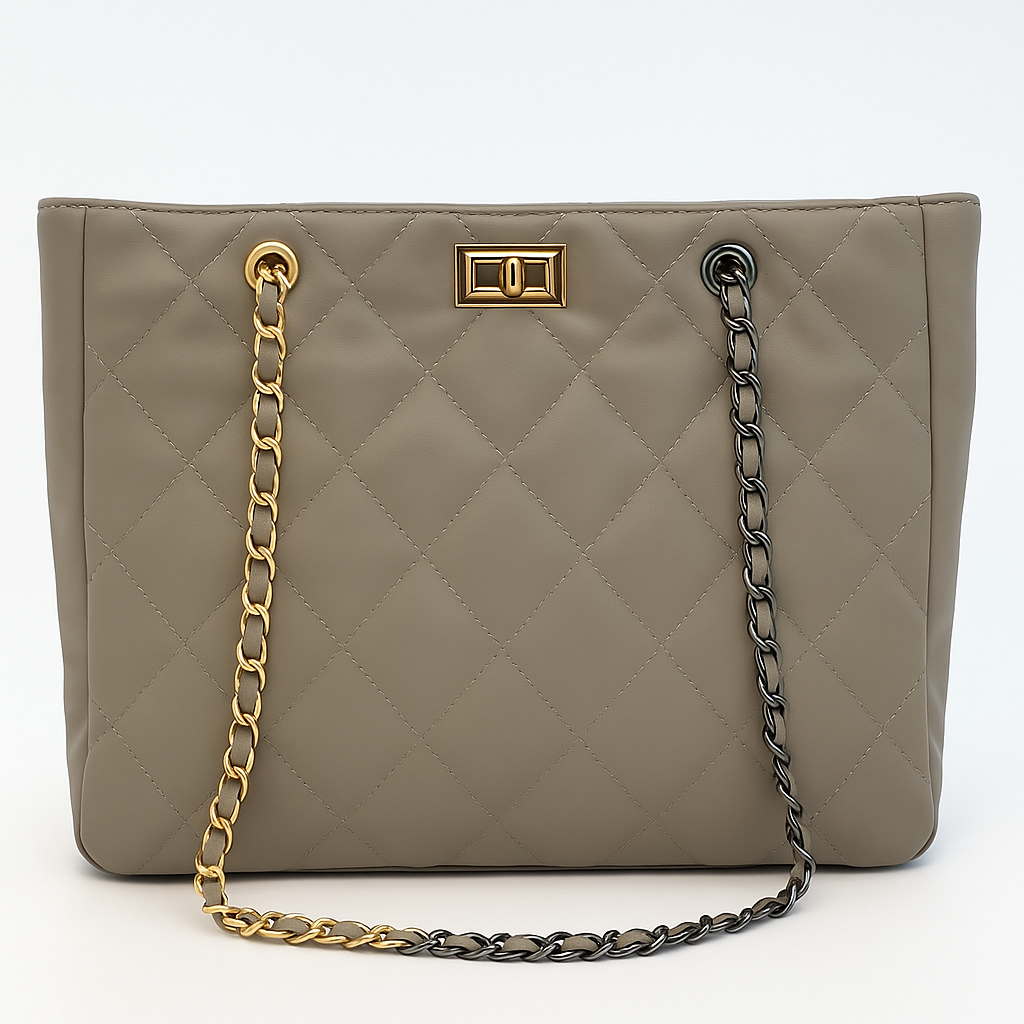 תיק יד מעור יוקרתי בצבע אפור מבית FOREVER, עם עיצוב מרופד קלאסי ורצועת שרשרת כפולה בזהב ושחור. עשוי מחומרים איכותיים עם סגירה אלגנטית בזהב, מושלם למראה יומיומי או ערב.